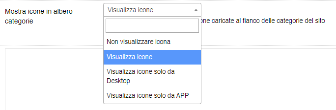 Questa opzione, raggiungibile tramite il menù delle impostazioni dell'ecommerce, permette di indicare al sistema se visualizzare o meno le icone di fianco le categorie sul sito e-commerce e sull'APP.![]()