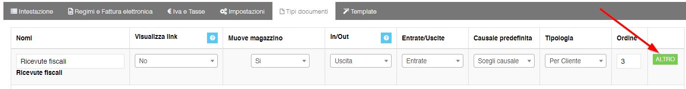 una volta nella pagaina delle impostazioni, andare nella scheda "Tipi Documenti" scegliere il documento da impostare, cliccare sul pulsante "Altro" :