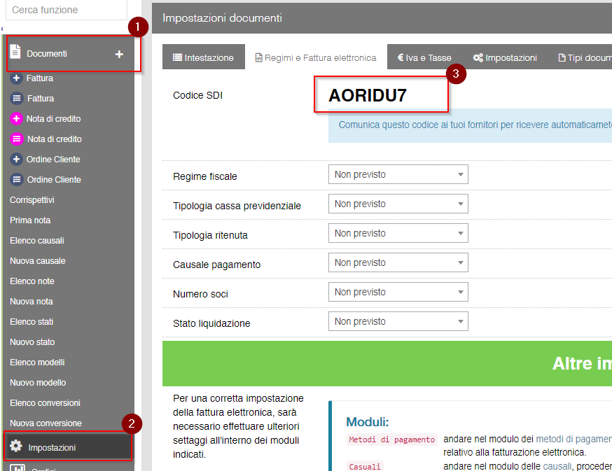 Indicare il codice destinatario, come metodo preferito, ed inserire il codice che si trova nell'area: Documenti -> Impostazioni -> (scheda) Reimi e fatturazione elettronica, come indicato di seguito: